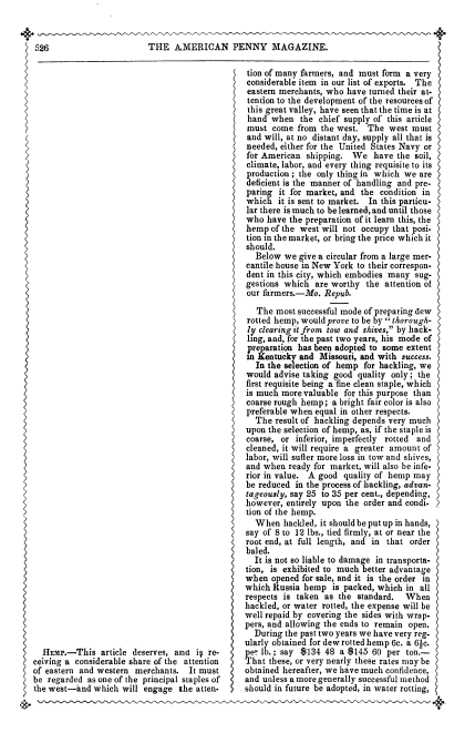 Hemp, ---. Dwight's American Magazine and Family Newspaper, Vol. 2 (1846), 2 pages. CD (HWDA07). Posted May 14, 2004. SAMPLE PAGE. File size 468 KB PDF