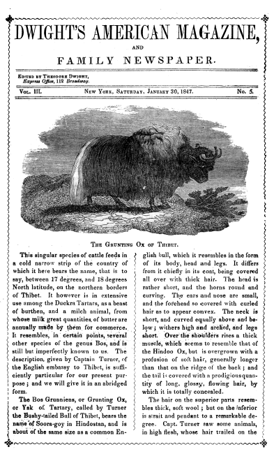 The Grunting Ox of Thibet, ---. Dwight's American Magazine and Family Newspaper, Vol. 3, No. 5 (January 30, 1847), 2 pages. CD (HWDA07). Posted May 14, 2004. SAMPLE PAGE. File size 576 KB PDF