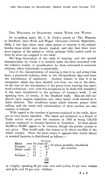 Weavers of Beadford, Their Work and Wages, ---. Economic Journal, Vol. 3, No. 12 (December 1893), 1 page. CD (HWDA10). Posted June 20, 2004. SAMPLE PAGE. File size 456 KB PDF