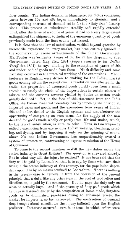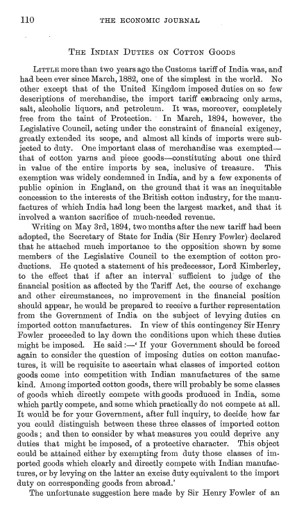 The Indian Duties on Cotton Goods, Helm, Elijah. Economic Journal, Vol. 6, No. 21 (Mar 1896), 5 pages. Posted November 11, 2006. SAMPLE PAGE. File size 608 KB PDF