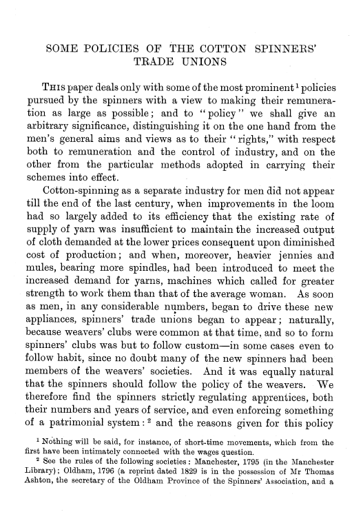 Some Policies of the Cotton Spinners' Trade Unions, Chapman, S.J. Economic Journal, Vol. 10, No. 40 (December 1900), 7 pages. Posted November 11, 2006. SAMPLE PAGE. File size 726 KB PDF