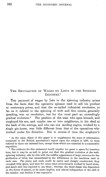 Regulation of Wages by Lists in the Spinning Industry, Chapman, S. J. Economic Journal, Vol. 9, No. 36 (December 1899), 8 pages. CD (HWDA07). Posted February 18, 2004. SAMPLE PAGE. File size 800 KB PDF
