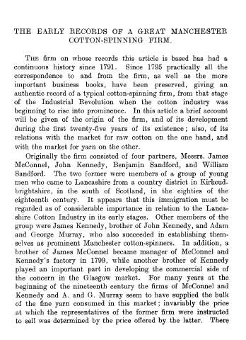 Early Records of a Great Manchester Cotton-Spinning Firm, Daniels, G. W. Economic Journal, Vol. 25, No. 98 (June 1915), 14 pages. CD (HWDA07). Posted February 18, 2004. SAMPLE PAGE. File size 1.1 MB PDF