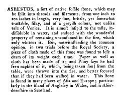 Asbestos, ---. Encyclopedia Britannica, 1st ed., 1771, 1 page. Posted March 8, 2004. SAMPLE PAGE. File size 412 KB PDF