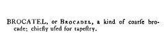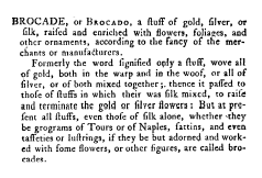 Brocade, ---. Encyclopedia Britannica, 1st ed., 1771, 1 page. Posted March 8, 2004. SAMPLE PAGE. File size 404 KB PDF