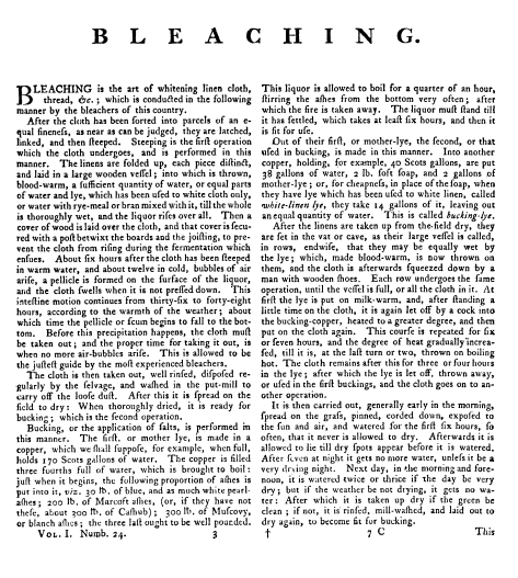 Bleaching, ---. Encyclopedia Britannica, 1st ed., 1771, 12 pages. Posted March 9, 2004. SAMPLE PAGE. File size 1.6 MB PDF