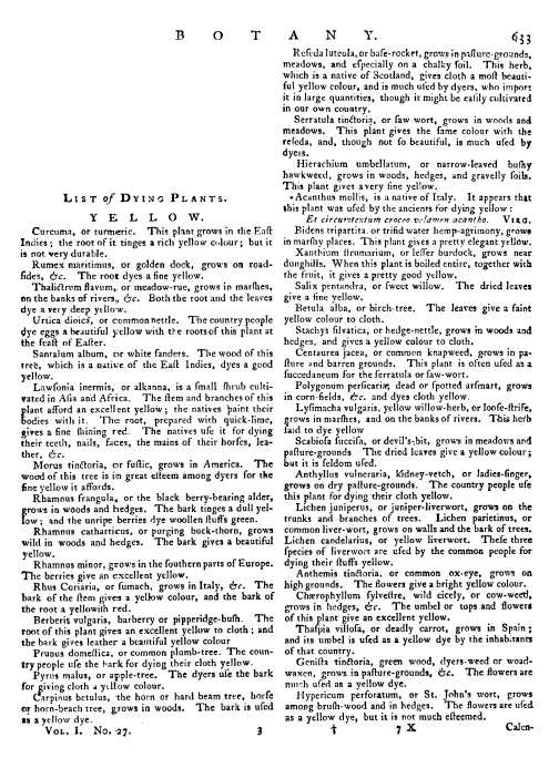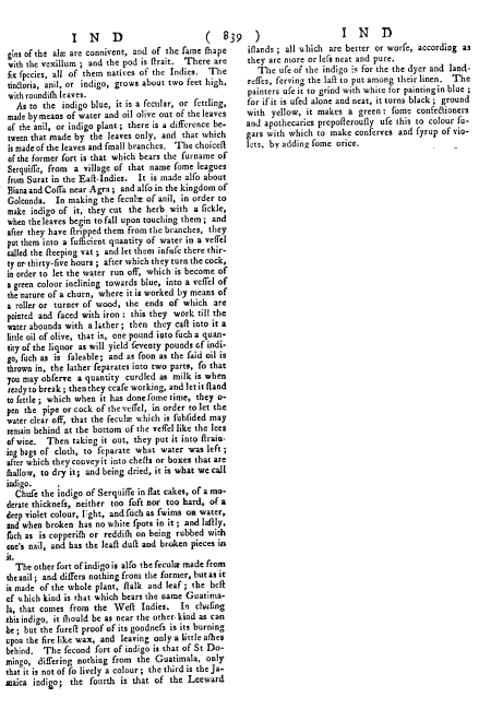 Indigo, ---. Encyclopedia Britannica, 1st ed., 1771, 2 pages. Posted June 26, 2003. SAMPLE PAGE. File size 468 KB PDF