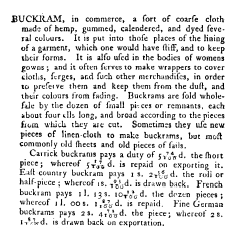 Buckram, ---. Encyclopedia Britannica, 1st ed., 1771, 1 page. Posted March 8, 2004. SAMPLE PAGE. File size 416 KB PDF