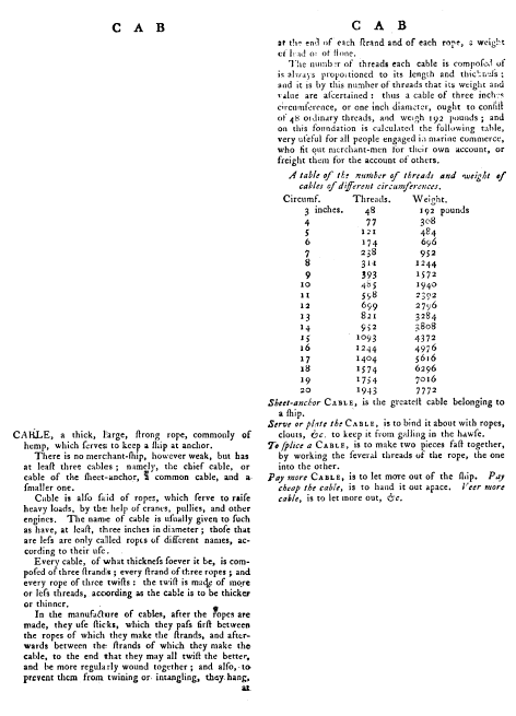 Cable, ---. Encyclopedia Britannica, 1st ed., 1771, 1 page. Posted March 8, 2004. SAMPLE PAGE. File size 444 KB PDF