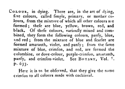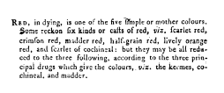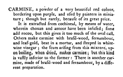 Carmine, ---. Encyclopedia Britannica, 1st ed., 1771, 1 page. Posted March 9, 2004. SAMPLE PAGE. File size 404 KB PDF