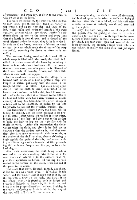 Cloth, ---. Encyclopedia Britannica, 1st ed., 1771, 2 pages. Posted June 26, 2003. SAMPLE PAGE. File size 524 KB PDF