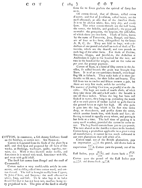 Cotton, ---. Encyclopedia Britannica, 1st ed., 1771, 1 page. Posted June 26, 2003. SAMPLE PAGE. File size 452 KB PDF