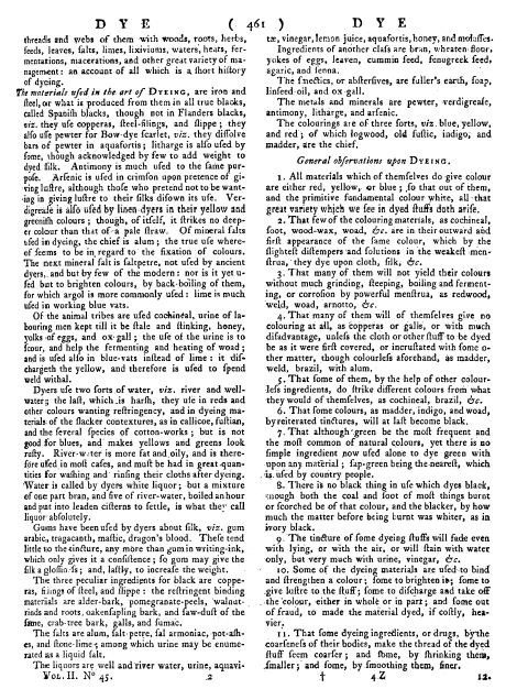 Dyeing, ---. Encyclopedia Britannica, 1st ed., 1771, 4 pages. Posted June 26, 2003. SAMPLE PAGE. File size 732 KB PDF