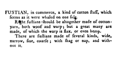 Fustian, ---. Encyclopedia Britannica, 1st ed., 1771, 1 page. Posted March 8, 2004. SAMPLE PAGE. File size 400 KB PDF