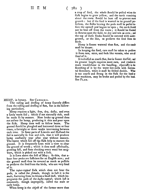Hemp, ---. Encyclopedia Britannica, 1st ed., 1771, 1 page. Posted June 26, 2003. SAMPLE PAGE. File size 444 KB PDF