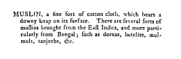 Muslin, ---. Encyclopedia Britannica, 1st ed., 1771, 1 page. Posted March 9, 2004. SAMPLE PAGE. File size 396 KB PDF