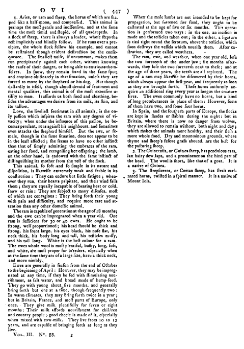 Ovis (Sheep), ---. Encyclopedia Britannica, 1st ed., 1771, 2 pages. Posted January 27, 2004. SAMPLE PAGE. File size 532 KB PDF