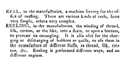 Reel and Reeling, ---. Encyclopedia Britannica, 1st ed., 1771, 1 page. Posted March 9, 2004. SAMPLE PAGE. File size 404 KB PDF