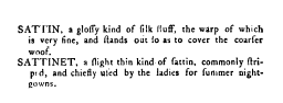 Sattin and Sattinet, ---. Encyclopedia Britannica, 1st ed., 1771, 1 page. Posted March 9, 2004. SAMPLE PAGE. File size 396 KB PDF