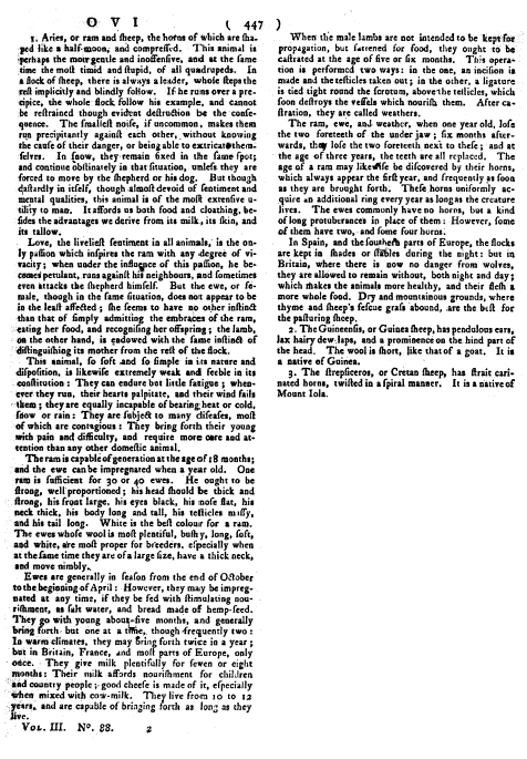 Ovis (Sheep), ---. Encyclopedia Britannica, 1st ed., 1771, 2 pages. Posted March 9, 2004. SAMPLE PAGE. File size 520 KB PDF