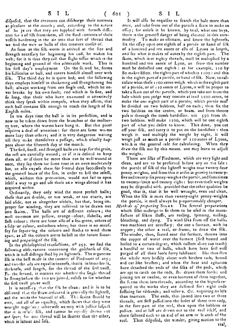 Silk, ---. Encyclopedia Britannica, 1st ed., 1771, 3 pages. Posted July 1, 2003. SAMPLE PAGE. File size 586 KB PDF