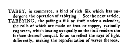 Tabby and Tabbying, ---. Encyclopedia Britannica, 1st ed., 1771, 1 page. Posted March 25, 2004. SAMPLE PAGE. File size 400 KB PDF