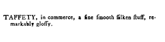 Taffety, ---. Encyclopedia Britannica, 1st ed., 1771, 1 page. Posted March 9, 2004. SAMPLE PAGE. File size 392 KB PDF