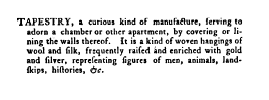Tapestry, ---. Encyclopedia Britannica, 1st ed., 1771, 1 page. Posted March 9, 2004. SAMPLE PAGE. File size 396 KB PDF