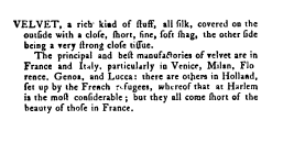 Velvet, ---. Encyclopedia Britannica, 1st ed., 1771, 1 page. Posted March 9, 2004. SAMPLE PAGE. File size 400 KB PDF