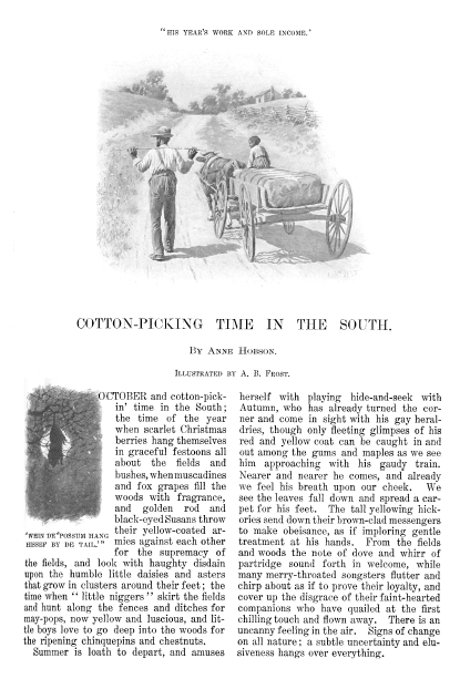 Cotton-Picking Time in the South, Hobson, Anne. Everybody's Magazine, Vol. 6, No. 1 (January 1902), 7 pages. CD (HWDA08). Posted April 12, 2003. SAMPLE PAGE. File size 1.2 MB PDF