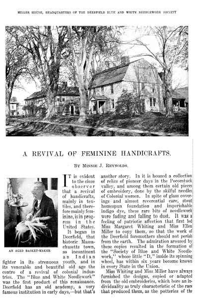 Revival of Feminine Handicrafts, Reynolds, Minnie J. Everybody's Magazine, Vol. 7, No. 2 (July 1902), 5 pages. CD (HWDA08). Posted April 15, 2003. SAMPLE PAGE. File size 1 MB PDF