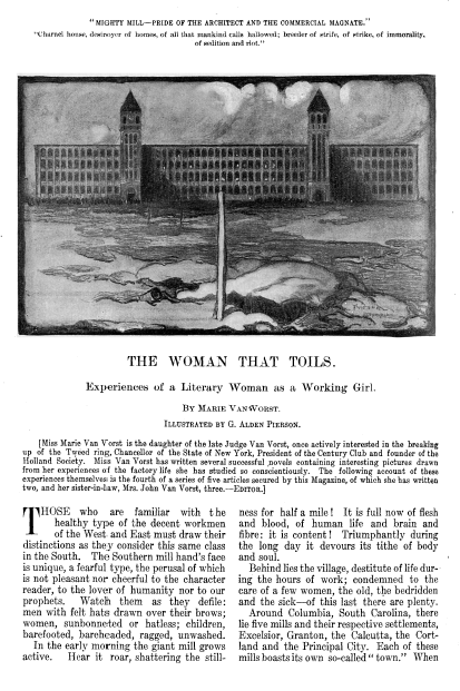 Woman That Toils, Van Vorst, Marie. Everybody's Magazine, Vol. 7, No. 6 (December 1902), 13 pages. CD (HWDA08). Posted April 15, 2003. SAMPLE PAGE. File size 1.9 MB PDF