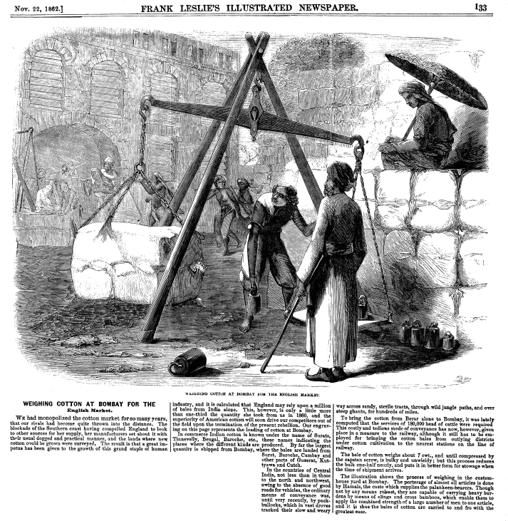 Weighing Cotton at Bombay for the English Market, ---. Frank Leslie's Illustrated Newsletter, November 22, 1862, 1 page. CD (HWDA09). Posted August 16, 2003. SAMPLE PAGE. File size 744 KB PDF