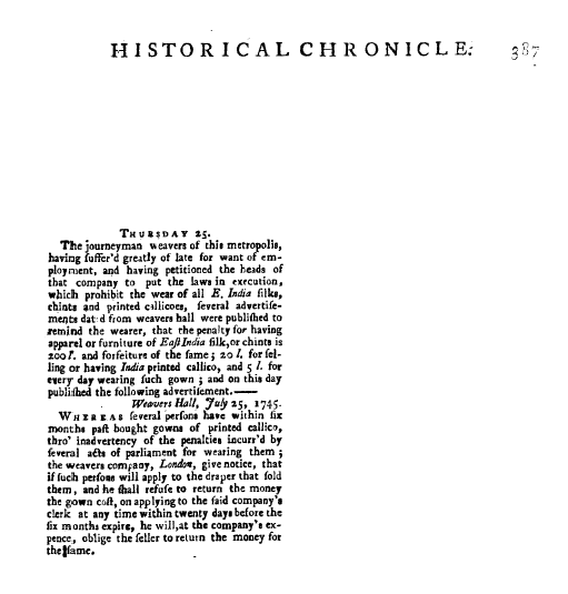 [Weavers], ---. Gentlemen's Magazine, July 1746, 1 page. CD (HWDA09). Posted July 4, 2004. SAMPLE PAGE. File size 408 KB PDF