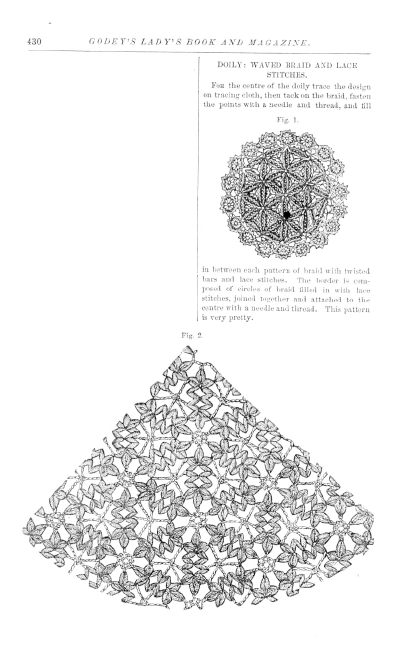 Doily: Waved Braid and Lace Stitches, ---. Godey's Lady's Book and Magazine, Vol. 96 (May 1878), 1 page. CD (HWDA07). Posted December 12, 2003. SAMPLE PAGE. File size 568 KB PDF