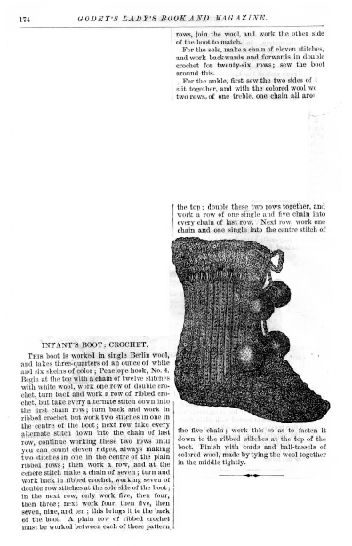 Infant's Boot in Crochet, ---. Godey's Lady's Book and Magazine, Vol. 85 (August 1872), 1 page. CD (HWDA07). Posted December 12, 2003. SAMPLE PAGE. File size 624 KB PDF