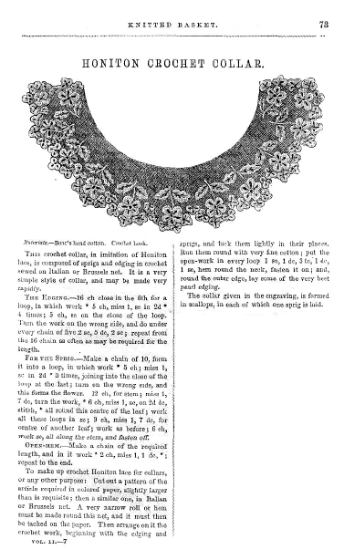 Honiton Crochet Collar, ---. Godey's Lady's Book and Magazine, Vol. 51 (July 1855), 1 page. CD (HWDA07). Posted December 12, 2003. SAMPLE PAGE. File size 628 KB PDF
