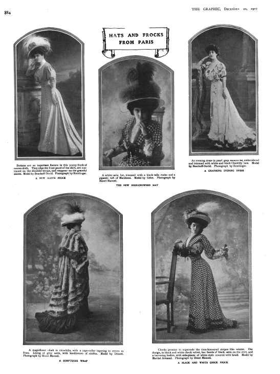 Hat and Frocks from Paris, ---. The Graphic, December 21, 1907, 1 page. Note: Reduced to 70% to fit on page. CD (HWDA11). Posted October 4, 2004. SAMPLE PAGE. File size 788 KB PDF