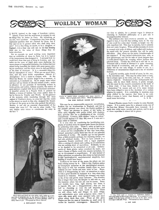 Worldly Woman, ---. The Graphic, October 12, 1907, 1 page. Note: Reduced to 70% to fit on page. CD (HWDA11). Posted October 4, 2004. SAMPLE PAGE. File size 816 KB PDF