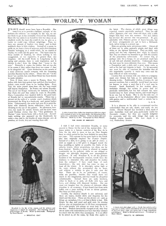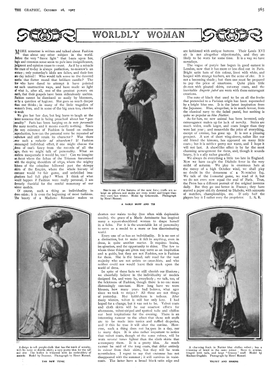 Worldly Woman, ---. The Graphic, November 9, 1907, 1 page. Note: Reduced to 70% to fit on page. CD (HWDA11). Posted October 4, 2004. SAMPLE PAGE. File size 780 KB PDF