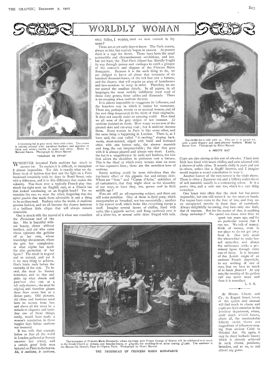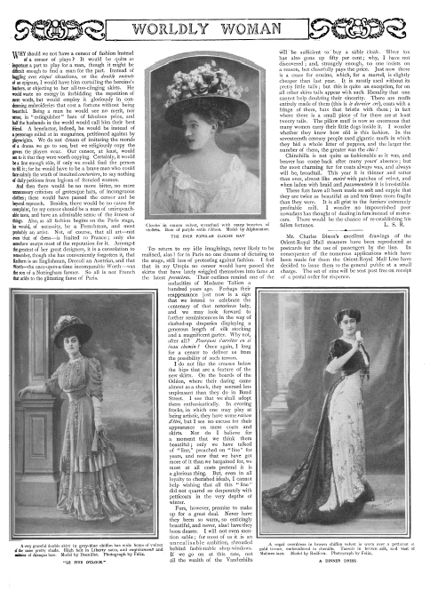 Worldly Woman, ---. The Graphic, December 7, 1907, 1 page. Note: Reduced to 70% to fit on page. CD (LDA04). Posted February 1, 2004. SAMPLE PAGE. File size 832 KB PDF