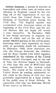 Cotton Famine, ---. Harper's Encyclopaedia of United States History, 1902, 1 page. Posted June 18, 2004. SAMPLE PAGE. File size 412 KB PDF