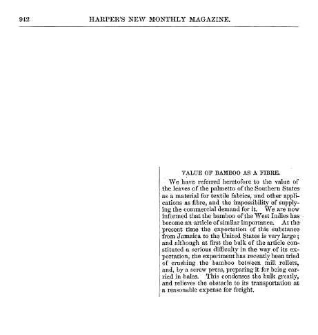 Value of Bamboo as a Fiber, ---. Harper's New Monthly Magazine, 1 page. CD (HWDA10). Posted September 12, 2004. SAMPLE PAGE. File size 428 KB PDF