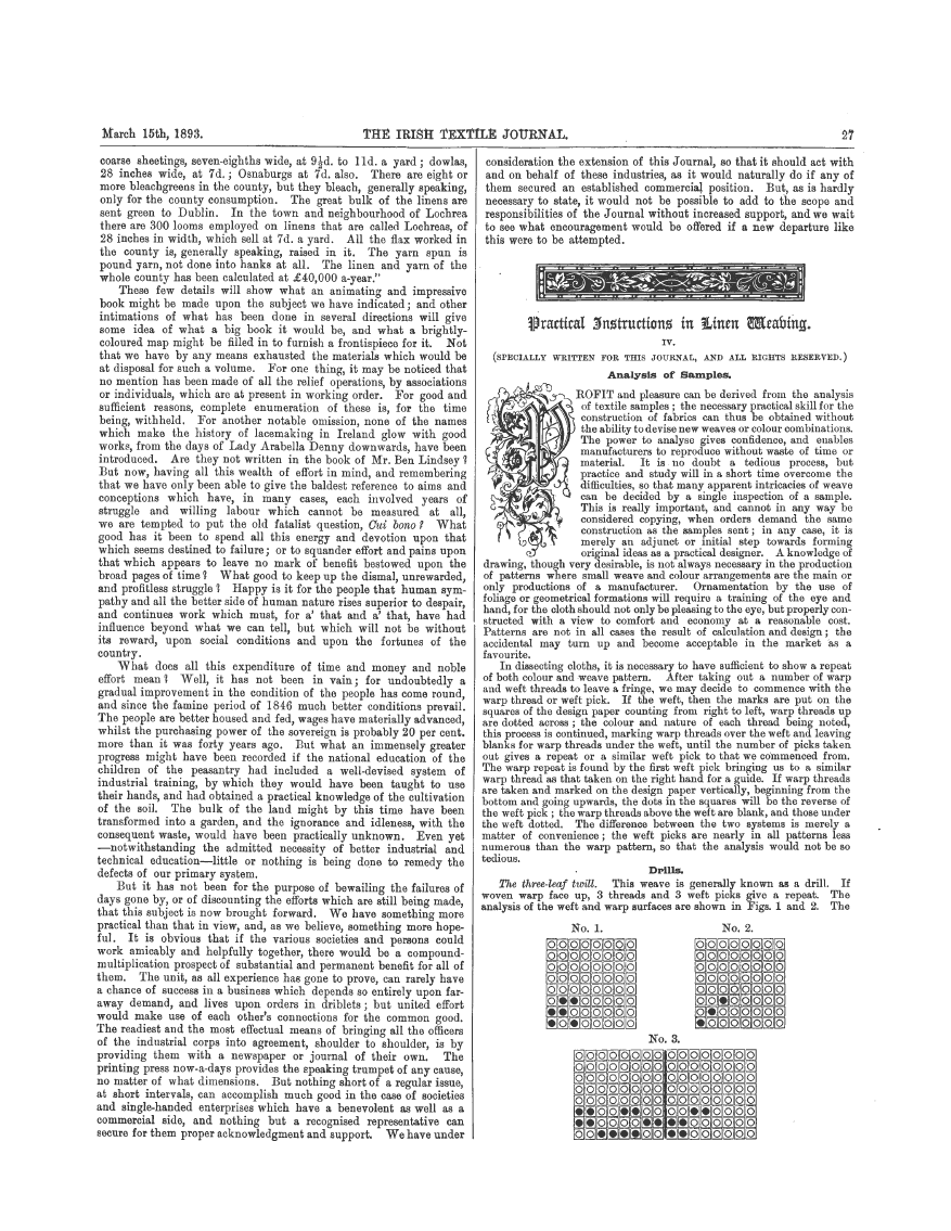 Practical Instructions in Linen Weaving, ---. Irish Textile Journal, March 1893, 3 pages. Note: Scanned images provided by John Cropper. Posted April 2, 2006. SAMPLE PAGE. File size 584 KB PDF