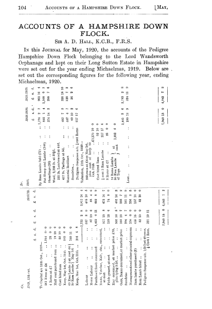 Accounts of a Hampshire Down Flock, Hall, A. D. Journal of the Ministry of Agriculture, Vol. 28 (1921), 6 pages. CD (HWDA11). Posted November 18, 2004. SAMPLE PAGE. File size 844 KB PDF