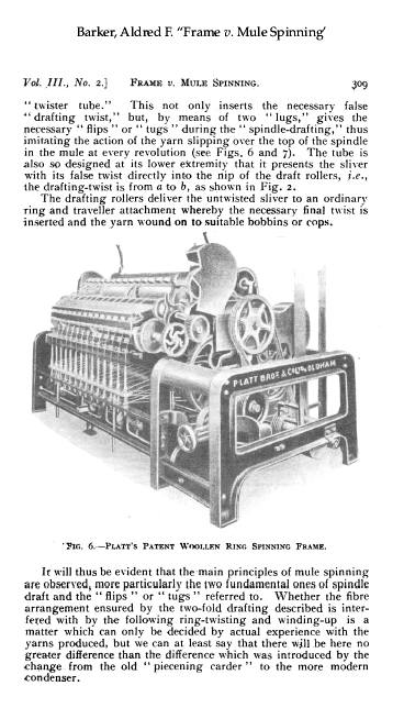 Frame v. Mule Spinning in the Woolen and Worsted Industries, Barker, Aldred F. Journal of The Textile Institute, Vol. 3, No. 2 (November, 1912), 14 pages. CD (HWDA08). Posted April 11, 2003. SAMPLE PAGE. File size 1.3 MB PDF