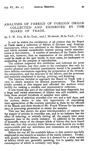 Analyses of Fabrics of Foreign Origin Collected and Exhibited by the Board of Trade, Fox, T. W. and J. Huebner. Journal of The Textile Institute, Vol. 6, No, 1 (May 1915), 38 pages. CD (HWDA08). Posted April 13, 2003. SAMPLE PAGE. File size 2.6 MB PDF