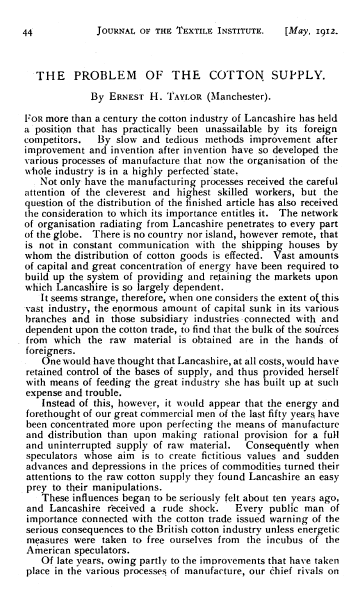 Problem of the Cotton Supply, Taylor, Ernest H. . Journal of The Textile Institute, Vol. 3, No, 1 (May 1912), 17 pages. CD (HWDA08). Posted April 12, 2003. SAMPLE PAGE. File size 1.6 MB PDF