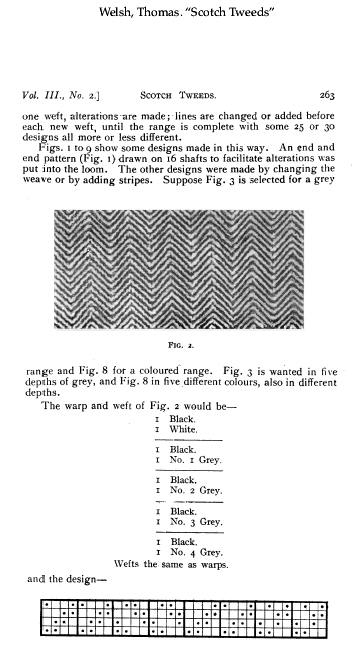 Designing and Colouring of Scotch Tweeds, Welsh, Thomas. Journal of The Textile Institute, Vol. 3, No, 2 (November 1912), 15 pages. CD (HWDA08). Posted April 11, 2003. SAMPLE PAGE. File size 1.5 MB PDF