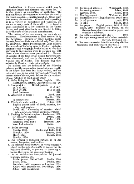 Asbestus, ---. Knight's American Mechanical Dictionary, 1876, 1 page. Posted May 7, 2004. SAMPLE PAGE. File size 453 KB PDF